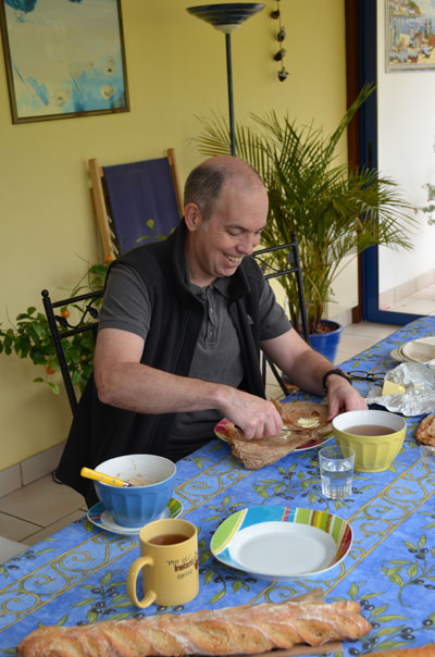 Gildas enjoying a typical Breton breakfast of buckwheat crêpes, and French baguette all with Breton butter!